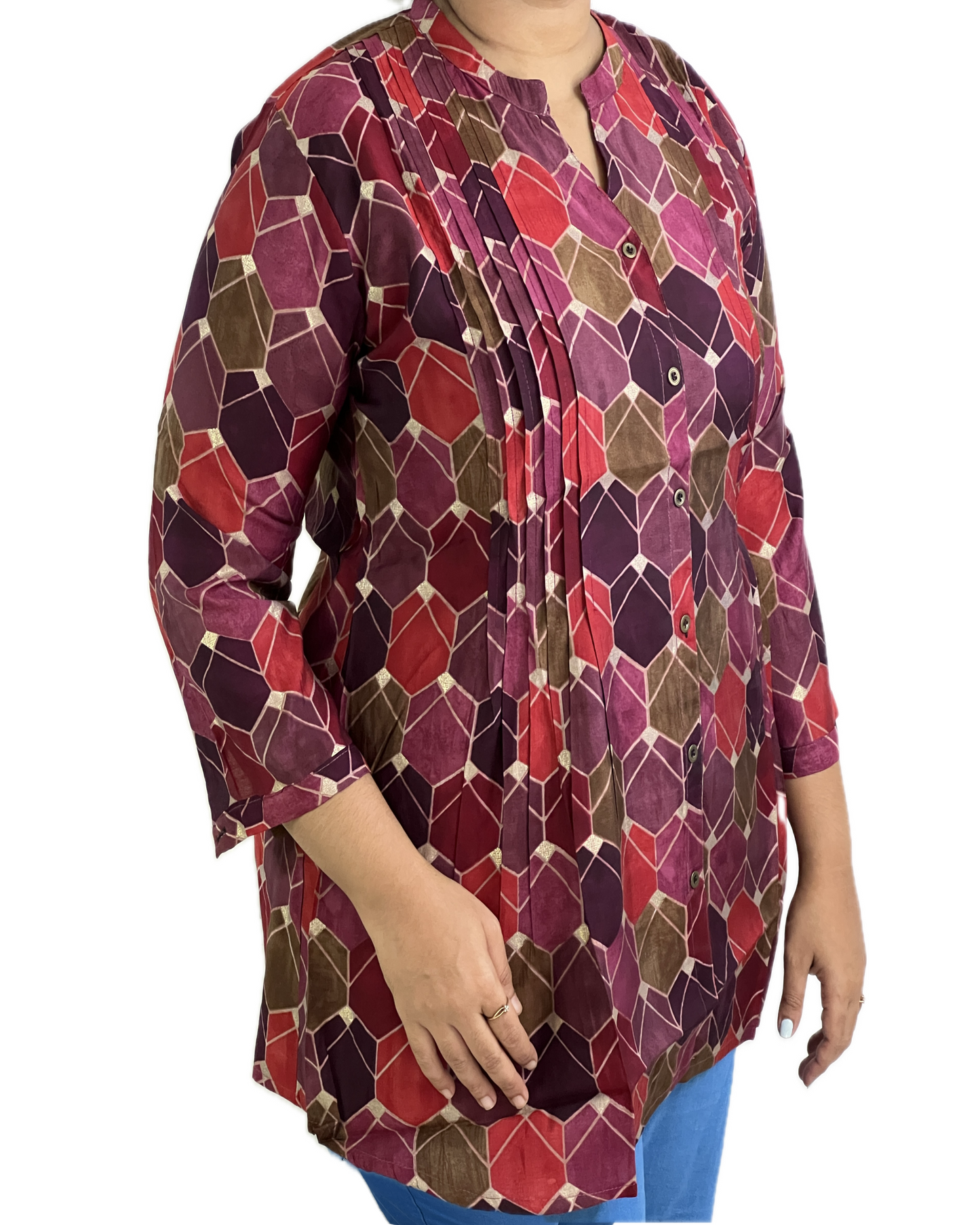 - Short Maslin silk Kurti with Vibrant color and geometric-patterned.